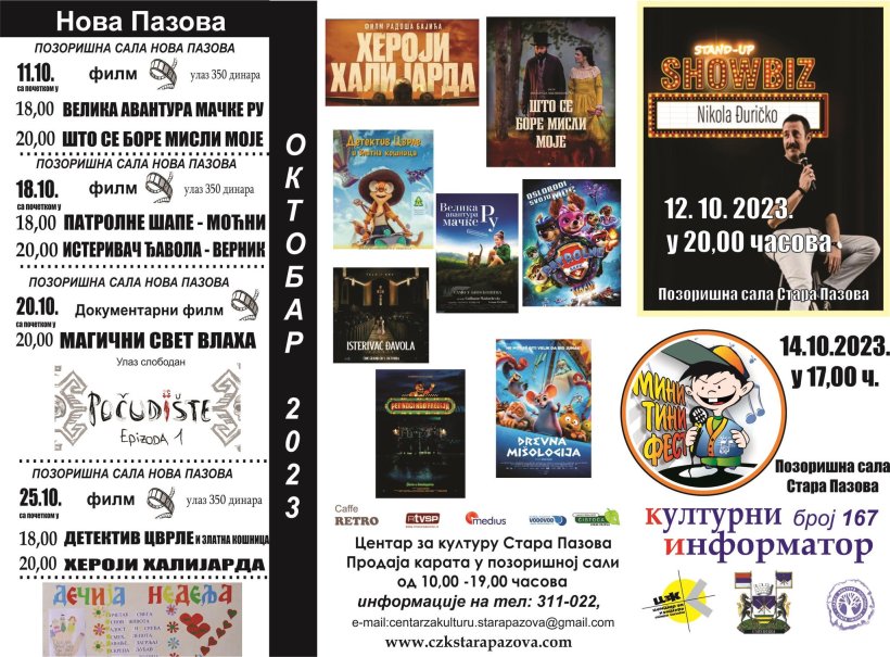 Mesec oktobar obiluje kulturnim događajima u staropazovačkoj opštini. Kao što su sugrađani i navikli od Centra za kulturu, svako će biti u prilici da izabere ono što najviše voli. Osnovci će imati priliku već 5. oktobra da uživaju uz program Baneta Rosića i leteće gitare u Pozorišnoj sali u 15 časova. Zatim 6. oktobra u 19 časova na istom mestu održaće se opštinska smotra likovnog stvaralaštva a u ponedeljak 9. oktobra biće otvorena kolektivna izložba slikarskog ateljea "Čarli" u galeriji Mira Brtka. U četvrtak 12. oktobra u Pazovu dolazi naš poznati glumac Nikola Đuričko sa hit predstavom "Showbizz", ulaznice su 1200 dinara i ostalo ih je jako malo.