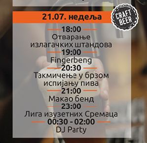Drugog dana festivala, u nedelju 21. jula posetioce takođe očekuje mnoštvo programa, između ostalog i takmičenje u brzom ispijanju piva. Od 19 časova nastupa Fingerbend, zatim i Makao bend, Liga izuzetnih Sremaca, a festival zatvara žurka koju će napraviti DJ.
