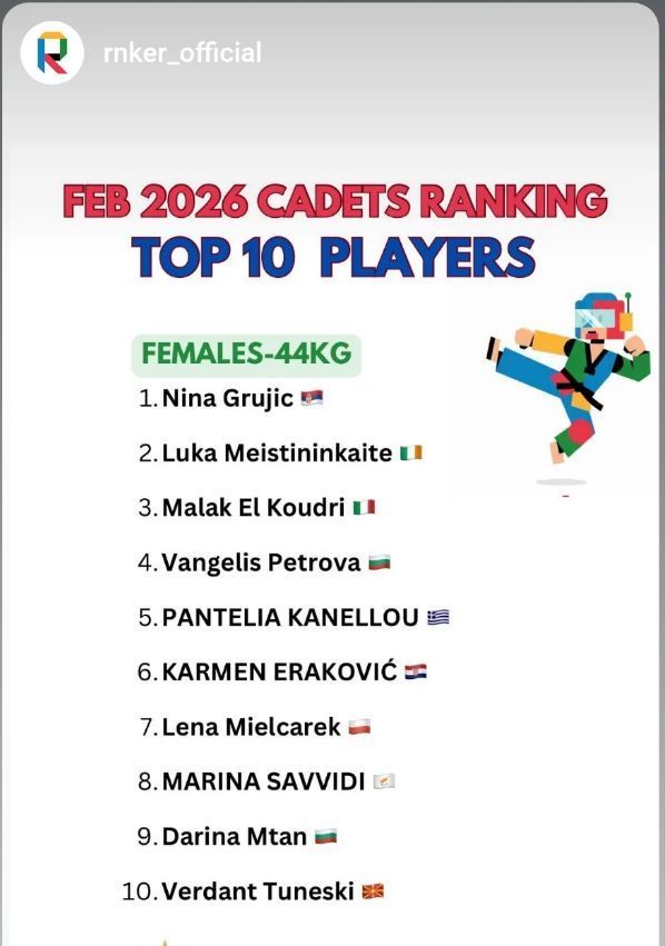 Mlada tekvondistkinja Nina Grujić, članica Tekvondo kluba Imperium Pazova iz Nove Pazove, zauzela je prvo mesto na evropskoj rang-listi za kadetkinje u kategoriji do 44 kilograma, prema zvaničnom februarskom poretku Evropske tekvondo federacije.