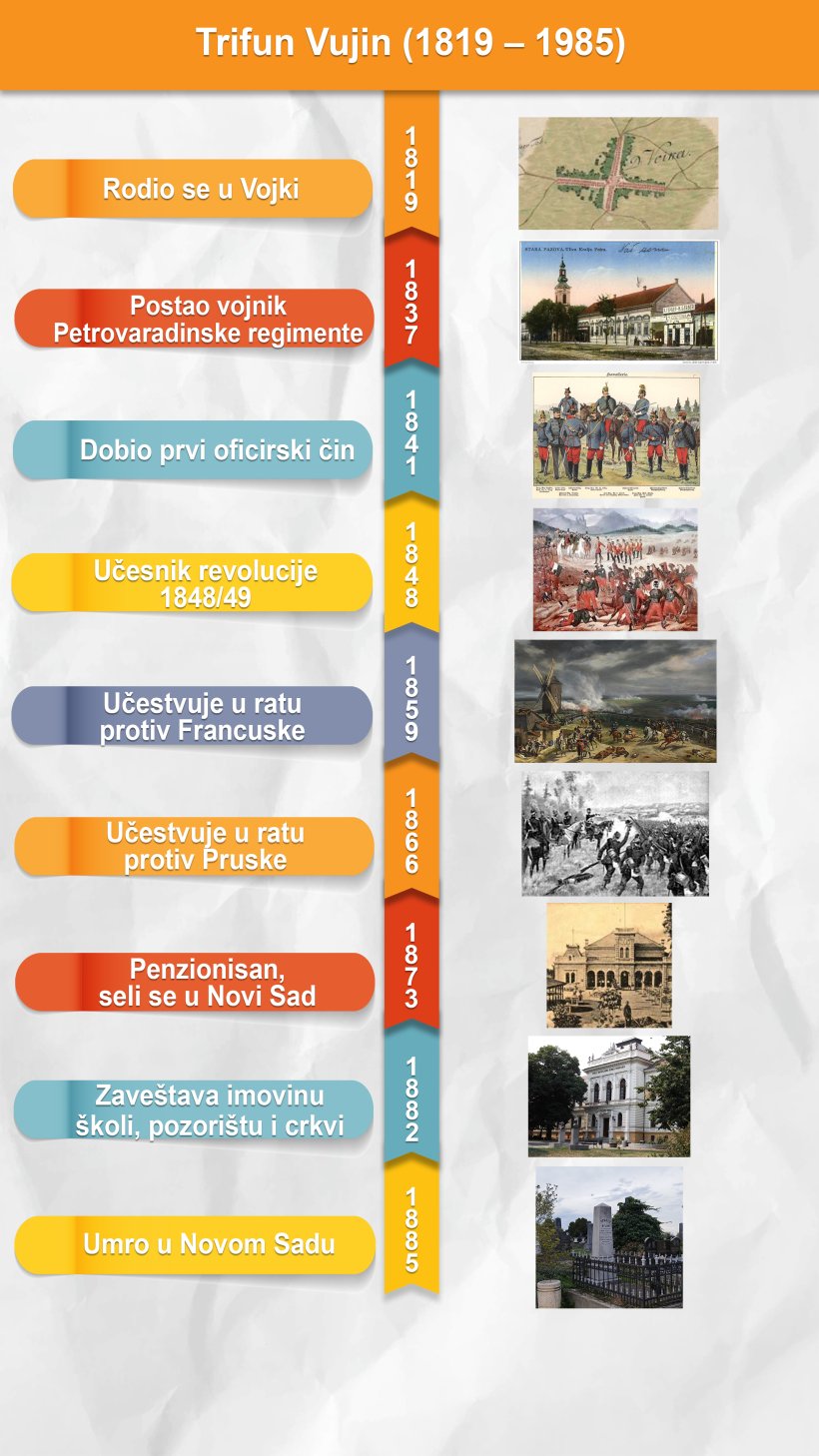 Pored oficirske karijere istakao se i kao veliki dobrotvor. Iza sebe je ostavio testament kojim je ostavio crkvi u Vojki 500 forinti i Srpskom narodnom pozorištu 100 forinti. Takođe, zaveštao je čak pet hiljada ondašnjih forinti Fondu Srpske velike gimnazije novosadske. Danas je to čuvena Gimnazija „Jovan Jovanović – Zmaj“ i tamo je Trifun Vujin apostrofiran kao jedan od najvećih dobrotvora ove ustanove koje postoji od 1811. godine.